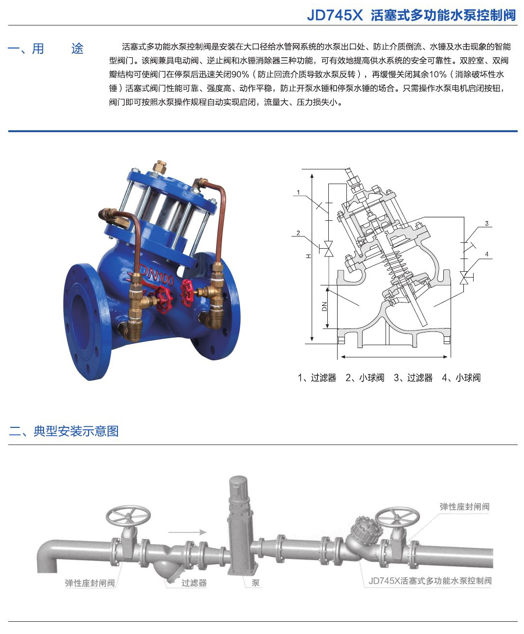 - 安裝在大口徑給水管網(wǎng)系統(tǒng)的水泵出口處、防止介質(zhì)倒流、水錘及水擊現(xiàn)象的智能型閥門。