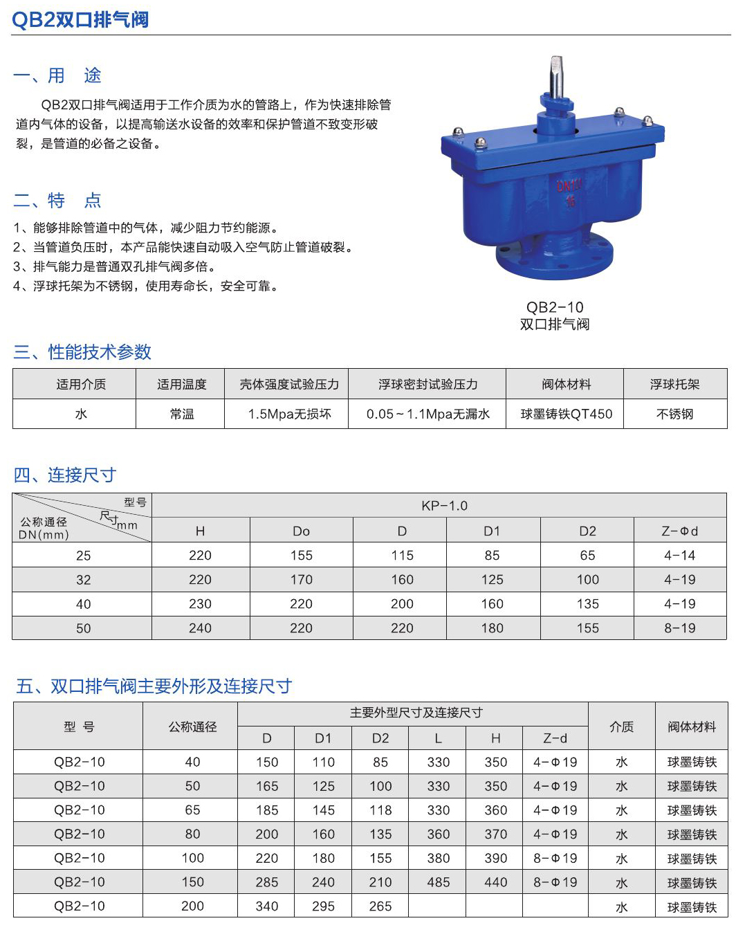 - QB2-10雙口排氣閥適用于工作介質(zhì)為水的管路上,作為快速排除管道內(nèi)氣體的設備,以提高輸送水設備的效率和保護管道不致變形破裂,是管道的必備之設備。