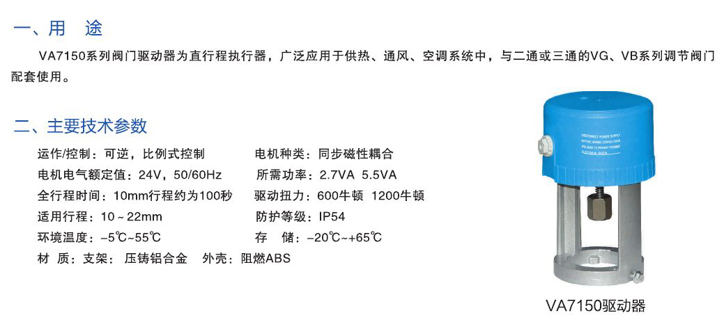 - VA7150系列閥門驅(qū)動器為直行程執(zhí)行器,廣泛應(yīng)用于供熱、通風(fēng)、空調(diào)系統(tǒng)中,與二通或三通的VG、VB系列調(diào)節(jié)閥門配套使用。