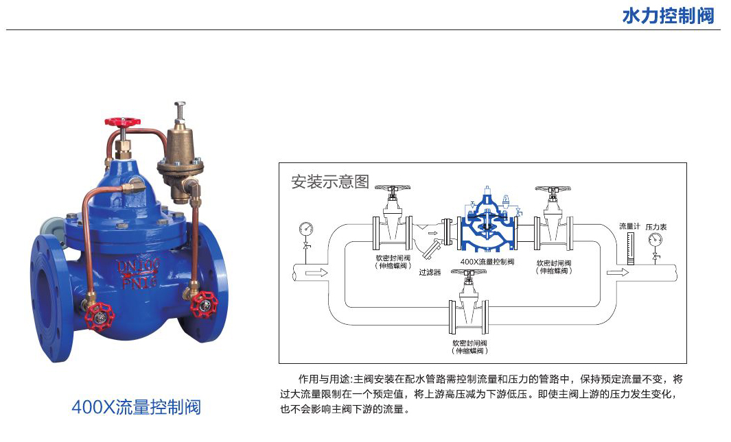 - 主閥安裝在配水管路需控制流量和壓力的管路中,保持預(yù)定流量不變,將過(guò)大流量限制在一個(gè)預(yù)定值,將上游高壓減為下游低壓。