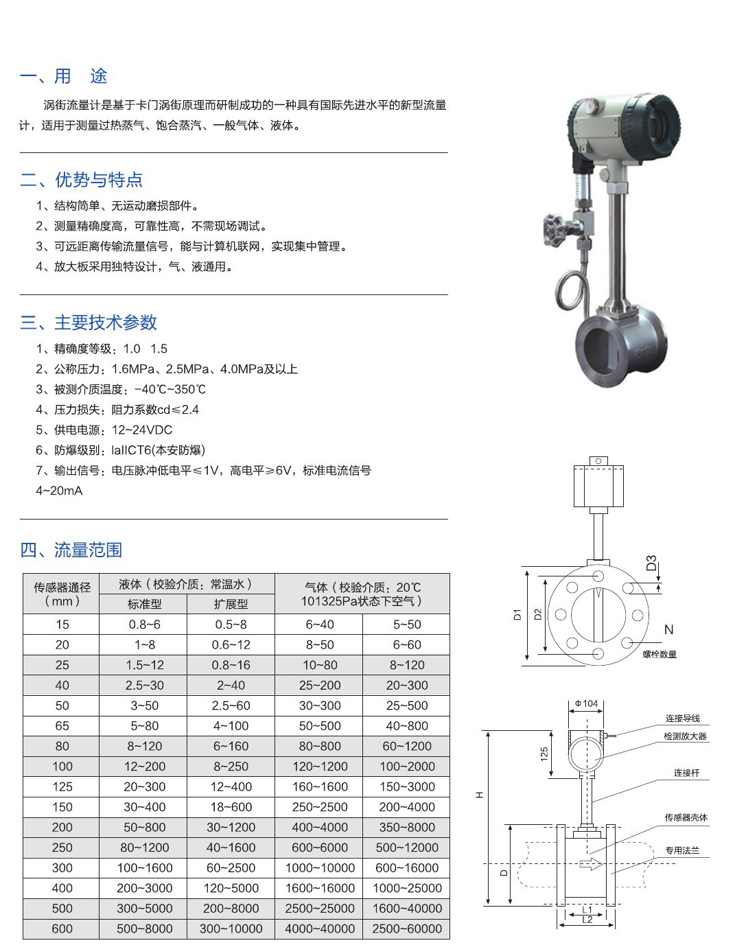 - 渦街流量計(jì)是基于卡門渦街原理而研制成功的一種具有國(guó)際先進(jìn)水平的新型流量計(jì),適用于測(cè)量過(guò)熱蒸氣、飽合蒸汽、一般氣體、液體。