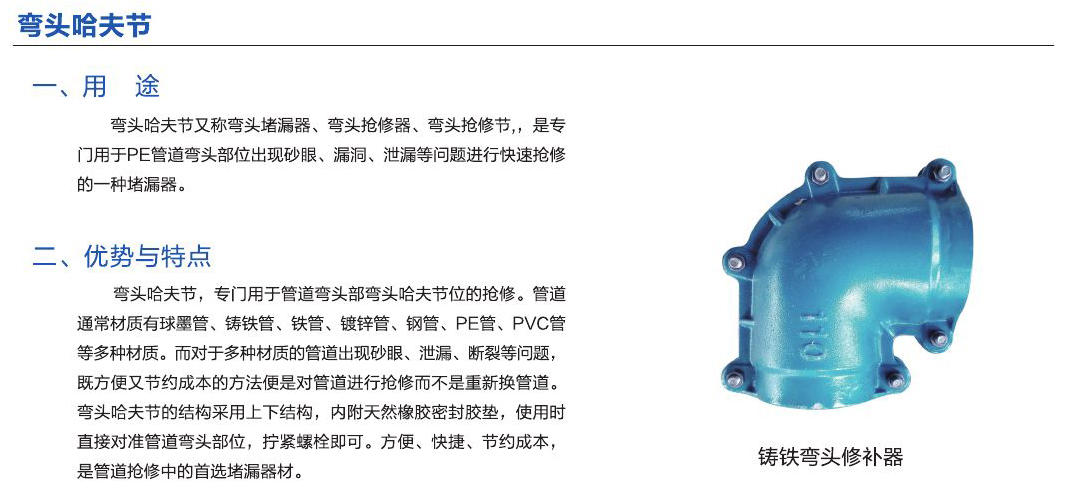 - 彎頭哈夫節(jié)又稱彎頭堵漏器、彎頭搶修器、彎頭搶修節(jié),是專門用于PE管道彎頭部位出現(xiàn)砂眼、漏洞、泄漏洞等問題進行快速搶修的一種堵漏器。